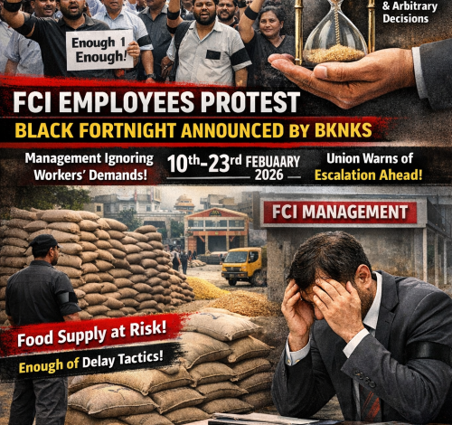 निश्चय टाइम्स डेस्क। भारतीय खाद्य निगम (FCI) में वर्षों से लंबित कर्मचारियों के मुद्दों को लेकर आखिरकार आक्रोश खुलकर सामने आ गया है। एफसीआई कर्मचारियों की एकमात्र मान्यता प्राप्त यूनियन, भारतीय खाद्य निगम कर्मचारी संघ (BKNKS) ने 10 फरवरी से 23 फरवरी 2026 तक देशभर के सभी एफसीआई कार्यालयों और डिपो में “काला पखवाड़ा” मनाने की घोषणा कर दी है।