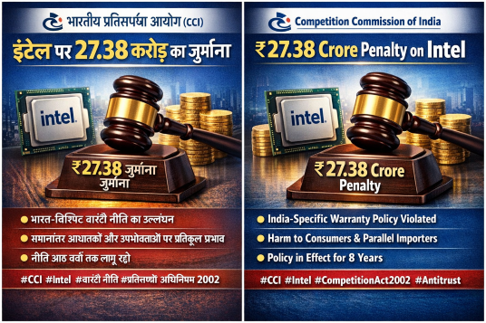 निश्चय टाइम्स न्यूज डेस्क भारतीय प्रतिस्पर्धा आयोग (सीसीआई) ने वैश्विक टेक कंपनी Intel Corporation पर भारत-विशिष्ट वारंटी नीति लागू करने के मामले में 27.38 करोड़ रुपये का जुर्माना लगाया है। यह आदेश प्रतिस्पर्धा अधिनियम, 2002 की धारा 27 के तहत पारित किया गया।