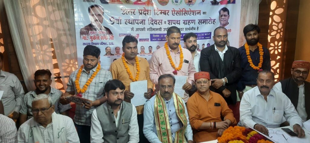 लखनऊ के ऐशबाग स्थित होटल स्काई हाई में 16 अप्रैल 2026 को उत्तर प्रदेश टिम्बर एसोसिएशन का 9वां स्थापना वर्ष “विजय दिवस” के रूप में पूरे उत्साह और भव्यता के साथ मनाया गया। इस अवसर पर संगठन की नई प्रदेश कार्यसमिति का शपथ ग्रहण समारोह भी आयोजित किया गया, जिसमें बड़ी संख्या में व्यापारियों और गणमान्य अतिथियों की उपस्थिति रही।
