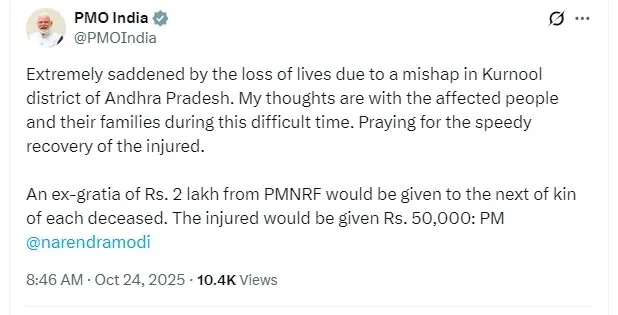 प्रधानमंत्री नरेंद्र मोदी ने भी गहरी संवेदना व्यक्त की और सहायता राशि की घोषणा की। पीएमओ के आधिकारिक हैंडल से जारी बयान में कहा गया, “कुरनूल जिले में हुई दुर्घटना से अत्यंत दुःखी हूं। मेरी संवेदनाएं प्रभावित परिवारों के साथ हैं। प्रधानमंत्री राष्ट्रीय राहत कोष से प्रत्येक मृतक के परिजनों को ₹2 लाख और घायलों को ₹50,000 की आर्थिक सहायता दी जाएगी।” मुख्यमंत्री चंद्रबाबू नायडू ने कहा, “कुरनूल जिले के चिन्ना टेकुर गांव के पास हुई इस दुर्घटना ने मन को झकझोर दिया है। मेरी हार्दिक संवेदनाएं उन परिवारों के साथ हैं जिन्होंने अपने प्रियजनों को खोया है। सरकार घायलों को हरसंभव मदद देगी।”