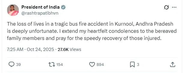राष्ट्रपति द्रौपदी मुर्मू ने इस हादसे पर शोक व्यक्त करते हुए एक्स (X) पर लिखा, “आंध्र प्रदेश के कुरनूल में बस में आग लगने की दुखद घटना में हुई जान-माल की हानि अत्यंत दुर्भाग्यपूर्ण है। मैं शोक संतप्त परिजनों के प्रति संवेदना व्यक्त करती हूं और घायलों के शीघ्र स्वस्थ होने की प्रार्थना करती हूं।”