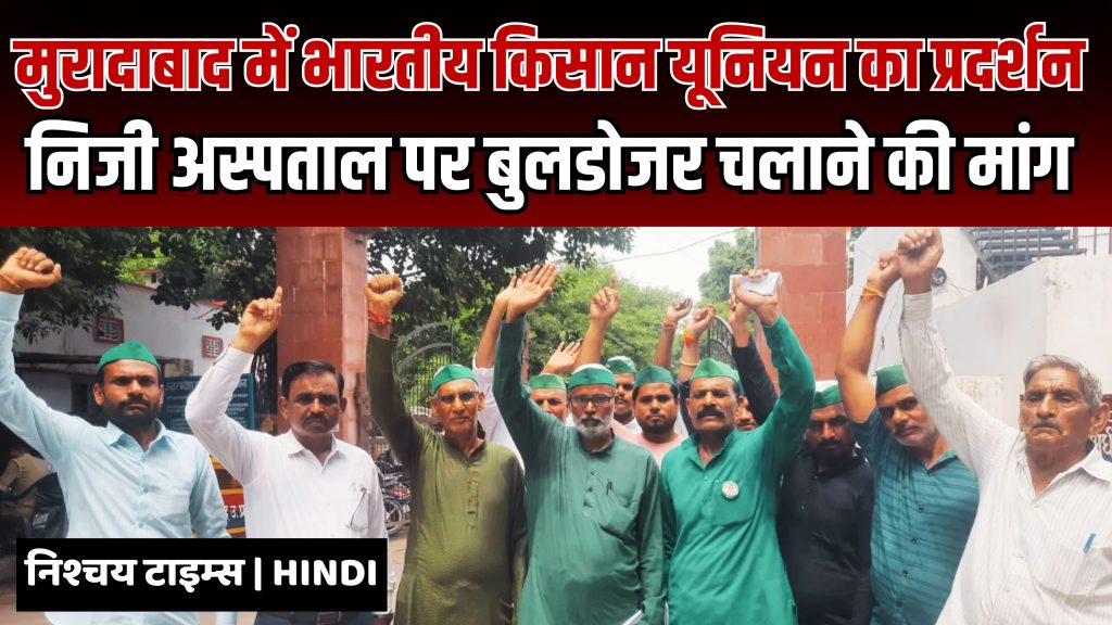 मुरादाबाद। मुरादाबाद के ठाकुरद्वारा क्षेत्र में हुई नर्स के साथ अनहोनी घटना को लेकर भारतीय किसान यूनियन (शंकर) ने शुक्रवार को कलेक्ट्रेट में जोरदार प्रदर्शन किया। इस दौरान मुख्यमंत्री को ज्ञापन भेजकर दोषी निजी अस्पताल पर बुलडोजर चलाने और आरोपित को अजीवन कारावास की सजा देने की मांग की गई।
