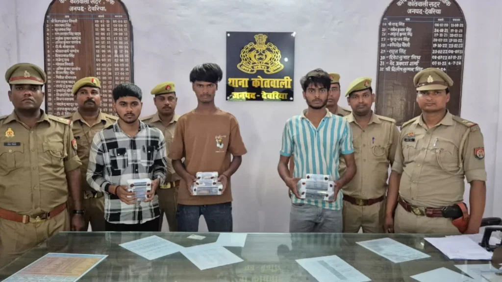 देवरिया जिले की सदर कोतवाली पुलिस ने मंगलवार को बड़ी कार्रवाई करते हुए दो शातिर चोरों और एक आभूषण व्यापारी को गिरफ्तार किया। पुलिस को यह सफलता अपराधियों के खिलाफ चलाए जा रहे अभियान के तहत गश्त के दौरान मिली। पुलिस अधीक्षक विक्रांत वीर के निर्देश पर चीनी मिल ग्राउंड के पास से दो संदिग्धों को पकड़ा गया, जिनके पास से एक 32 बोर की पिस्तौल, एक कारतूस मैगजीन सहित, 41,800 रुपये नगद, एक एंड्रॉयड और दो कीपैड फोन बरामद किए गए।
