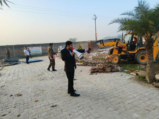 लगभग 03-03 बीघा (चिरान व मंधना) और 02 बीघा (सिंहपुर) क्षेत्र में की जा रही अवैध गतिविधियों के तहत बनाए गए एंट्री गेट, सड़क, नाला, बाउंड्रीवाल, बिजली के खंभे, पिलर तथा निर्मित/अर्धनिर्मित भवनों को 03 जेसीबी मशीनों की सहायता से पूरी तरह ध्वस्त कर दिया गया।
