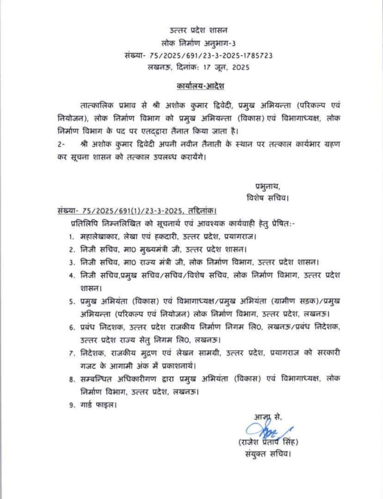 नए आदेश के अनुसार, अशोक कुमार द्विवेदी को लोक निर्माण विभाग का नया विभागाध्यक्ष नियुक्त किया गया है। उनके कंधों पर अब पूरे विभाग के प्रशासनिक और तकनीकी संचालन की जिम्मेदारी होगी। वहीं, मुकेश चंद्र शर्मा को ग्रामीण सड़कों से संबंधित कार्यों के लिए प्रमुख अभियंता (ग्रामीण सड़क) के पद पर तैनात किया गया है।