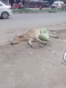 कर्नलगंज के चौरी चौराहे के पास सड़क हादसे में घायल दो दिनों से मरणासन्न हालत में पड़ कर आपनी मौत का इंतजार कर रही गाये.