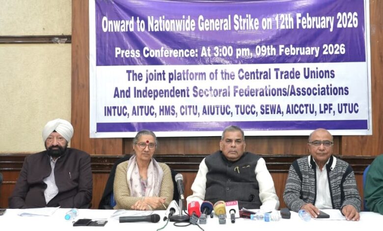 निश्चय टाइम्स डेस्क। केंद्रीय ट्रेड यूनियनों (CTUs) और स्वतंत्र क्षेत्रीय फेडरेशनों के संयुक्त मंच ने 12 फरवरी 2026 को देशव्यापी आम हड़ताल और बड़े पैमाने पर जनआंदोलन का आह्वान किया है। यह ऐलान प्रेस क्लब ऑफ इंडिया में आयोजित प्रेस कॉन्फ्रेंस में किया गया, जहां केंद्र सरकार की नीतियों को श्रमिक-विरोधी, किसान-विरोधी और कॉरपोरेट-परस्त बताया गया।