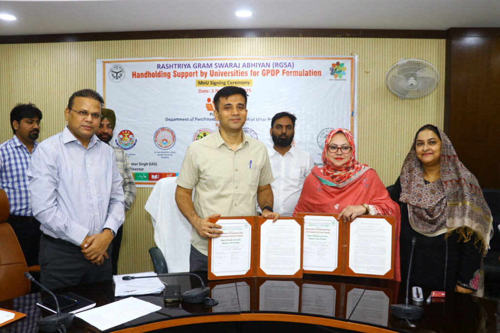 निश्चय टाइम्स, लखनऊ। पंचायती राज विभाग, उत्तर प्रदेश शासन एवं राज्य के छह प्रमुख विश्वविद्यालयों के मध्य आज मॉडल ग्राम पंचायत विकास योजनाओं (GPDPs) के निर्माण हेतु समझौता ज्ञापन (MoU) पर हस्ताक्षर किए गए। यह ऐतिहासिक पहल राष्ट्रीय ग्राम स्वराज अभियान (RGSA) के अंतर्गत आगामी वित्तीय वर्ष 2026-27 के लिए की गई है, जिसके तहत राज्य के 75 जनपदों की 750 ग्राम पंचायतों को चयनित किया गया है। कार्यक्रम का आयोजन अमित कुमार सिंह, आई.ए.एस., निदेशक, पंचायती राज विभाग, उत्तर प्रदेश की अध्यक्षता में किया गया। इस अवसर पर राज्य के प्रतिष्ठित विश्वविद्यालयों-