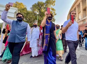 काला मास्क पहनकर और संविधान की प्रति लेकर विपक्षी सांसदों ने निकाला मार्च
