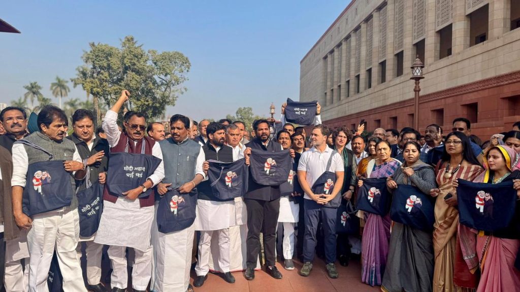 लोकसभा में विपक्ष के नेता राहुल गांधी, कांग्रेस महासचिव प्रियंका गांधी वाड्रा, कांग्रेस, डीएमके, झारखंड मुक्ति मोर्चा (जेएमएम), वाम दलों के सांसदों सहित अन्य सांसदों ने मकर द्वार की सीढ़ियों के सामने विरोध प्रदर्शन किया. ये सांसद काले रंग के ‘झोले’ लेकर आए थे, जिनके एक तरफ मोदी और अडाणी के कैरिकेचर छपे हुए थे तो दूसरी तरफ ‘मोदी अडाणी भाई-भाई’ लिखा हुआ था.