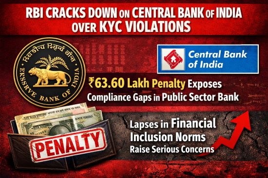 देश के प्रमुख सार्वजनिक क्षेत्र के बैंकों में शामिल Central Bank of India पर Reserve Bank of India (RBI) ने गंभीर अनियमितताओं के चलते ₹63.60 लाख का मौद्रिक दंड लगाया है। यह कार्रवाई बैंक द्वारा ‘Know Your Customer (KYC)’ और ‘Basic Savings Bank Deposit Account (BSBDA)’ से जुड़े नियमों के उल्लंघन के कारण की गई है, जिससे बैंकिंग प्रणाली की विश्वसनीयता पर सवाल खड़े हो गए हैं।