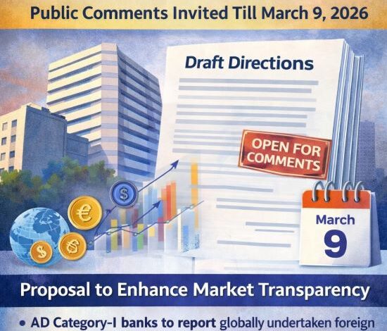 Reserve Bank of India (RBI) ने ऑथराइज्ड डीलर कैटेगरी–I बैंकों के लिए रिपोर्टिंग इंस्ट्रक्शंस पर ड्राफ्ट डायरेक्शंस जारी किए हैं। केंद्रीय बैंक ने बाजार प्रतिभागियों, हितधारकों और अन्य इच्छुक पक्षों से 9 मार्च 2026 तक इस ड्राफ्ट पर सुझाव और टिप्पणियां आमंत्रित की हैं।