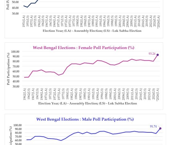 पश्चिम बंगाल विधानसभा चुनाव के दूसरे चरण में रिकॉर्ड मतदान का दावा किया गया है, लेकिन इसके साथ ही कई गंभीर सवाल भी खड़े हो गए हैं। भारत निर्वाचन आयोग के अनुसार, दूसरे चरण में 91.66% मतदान दर्ज किया गया, जबकि पहले चरण में यह आंकड़ा 93.19% रहा था। दोनों चरणों को मिलाकर कुल मतदान प्रतिशत 92.47% बताया गया है, जो राज्य के इतिहास में सबसे अधिक माना जा रहा है।