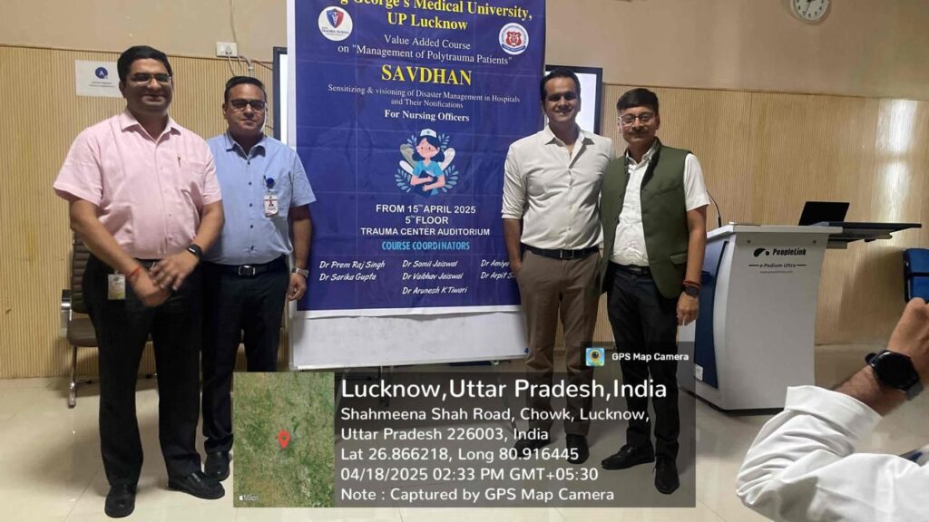 निश्चय टाइम्स लखनऊ। किंग जॉर्ज चिकित्सा विश्वविद्यालय (केजीएमयू) के ट्रॉमा सेंटर में एक अभिनव और अत्यंत उपयोगी प्रशिक्षण कार्यक्रम “सावधान” (SAVDHAN – Sensitizing And Visioning of Disaster management in Hospitals And their Notifications) शुभारंभ किया गया है। यह कोर्स नर्सिंग एवं पैरा मेडिकल स्टाफ को डिज़ास्टर एवं पॉलीट्रॉमा (बहु-अंग आघात) प्रबंधन के क्षेत्र में व्यावहारिक दक्षता और निर्णयात्मक क्षमता प्रदान करने के उद्देश्य से शुरू किया गया है ।