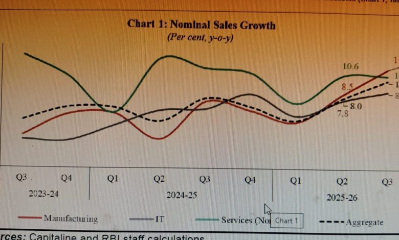 भारतीय रिजर्व बैंक द्वारा जारी आंकड़ों के अनुसार वित्त वर्ष 2025-26 की तीसरी तिमाही (Q3) में निजी कॉरपोरेट कारोबारी क्षेत्र ने मजबूत प्रदर्शन किया है। 3,188 सूचीबद्ध गैर-सरकारी, गैर-वित्तीय कंपनियों के तिमाही नतीजों पर आधारित रिपोर्ट में सामने आया है कि इस अवधि में कुल बिक्री वृद्धि 10.1 प्रतिशत (साल-दर-साल) रही, जो पिछले 11 तिमाहियों के एकल अंक की वृद्धि के बाद बड़ा सुधार है।