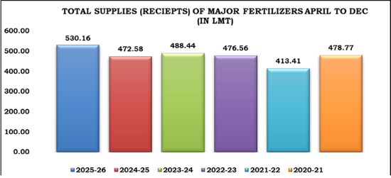 अप्रैल से दिसंबर 2025 के बीच कुल 530.16 लाख मीट्रिक टन उर्वरकों की आपूर्ति की गई, जो पहली बार 500 लाख मीट्रिक टन के आंकड़े को पार कर गई है। यह पिछले वित्त वर्ष 2024-25 की समान अवधि की तुलना में 12.2 प्रतिशत अधिक है, जबकि वर्ष 2023-24 के पूर्व रिकॉर्ड से 8.5 प्रतिशत अधिक दर्ज की गई।